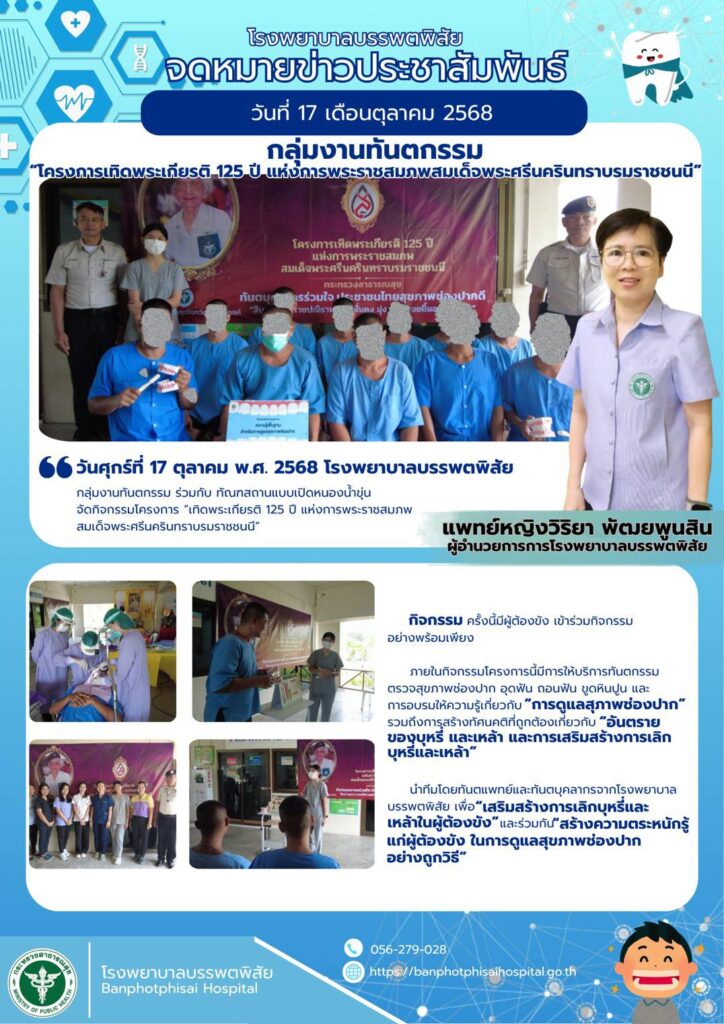 กลุ่มงานทันตกรรม โรงพยาบาลบรรพตพิสัย ร่วมกับ ทัณฑสถานเปิดหนองน้ำขุ่น ดำเนินโครงการ “เทิดพระเกียรติ 125 ปี แห่งการพระราชสมภพ สมเด็จพระศรีนครินทราบรมราชชนนี” OnePage