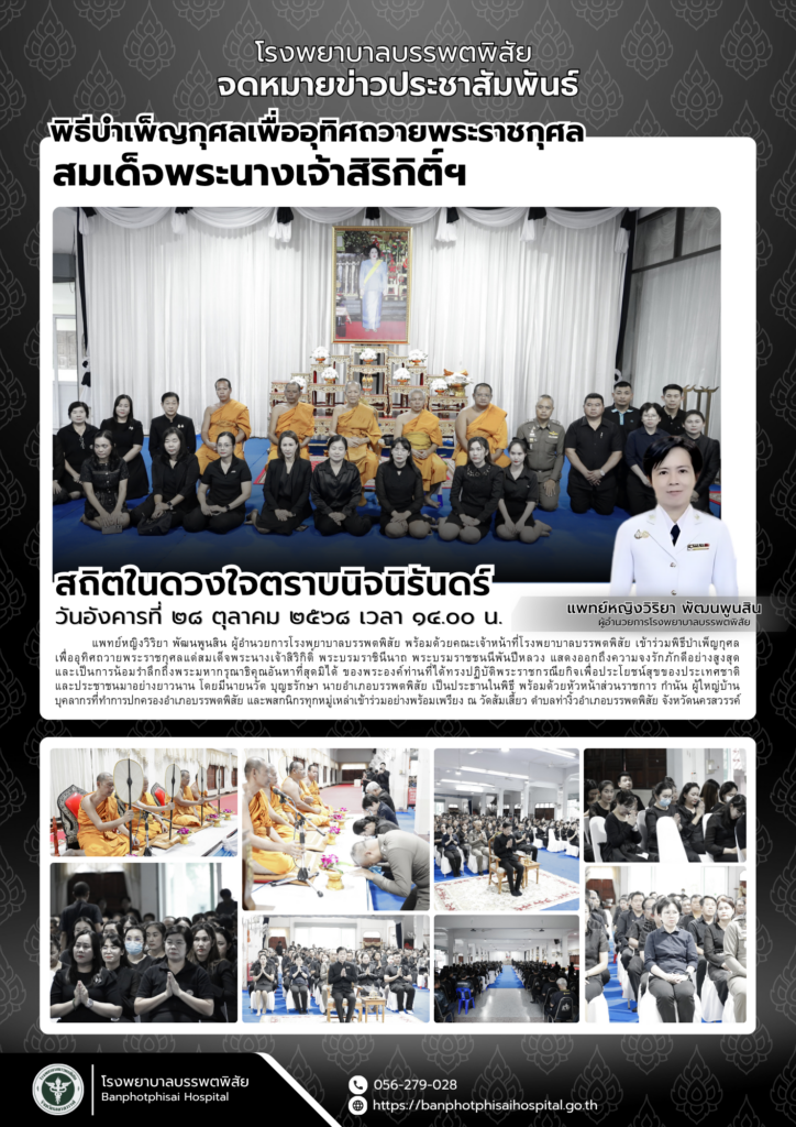 โรงพยาบาลบรรพตพิสัย เข้าร่วมกิจกรรมเฉลิมพระเกียรติ สมเด็จพระนางเจ้าสิริกิติ์ พระบรมราชินีนาถ พระบรมราชชนนีพันปีหลวง เนื่องในโอกาสวันเฉลิมพระชนมพรรษา ๑๒ สิงหาคม ๒๕๖๘ ณ ศาลาการเปรียญวัดส้มเสี้ยว อำเภอบรรพตพิสัย OnePage