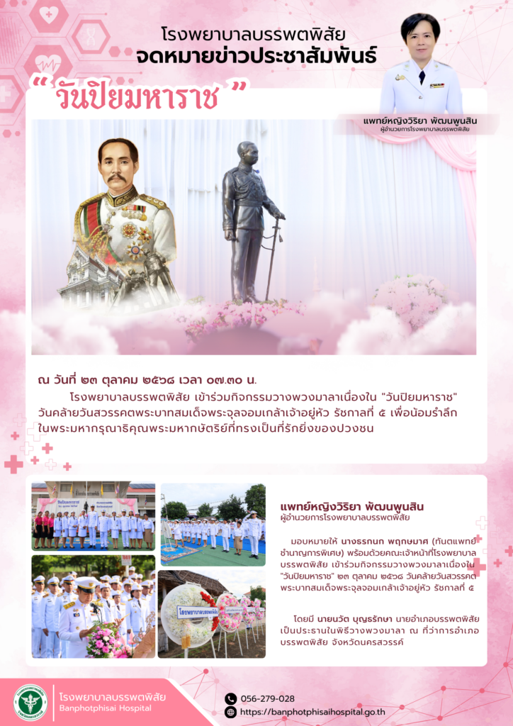 โรงพยาบาลบรรพตพิสัย เข้าร่วมกิจกรรมวางพวงมาลาเนื่องใน “วันปิยมหาราช” ๒๓ ตุลาคม ๒๕๖๘ วันคล้ายวันสวรรคตพระบาทสมเด็จพระจุลจอมเกล้าเจ้าอยู่หัว รัชกาลที่ ๕ เพื่อน้อมรำลึกในพระมหากรุณาธิคุณ พระมหากษัตริย์ที่ทรงเป็นที่รักยิ่งของปวงชน OnePage